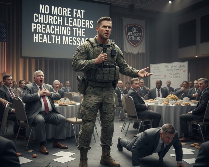 He then announced a new “GC Warrior Ethos” program to replace the Adventist Health Ministries Department, featuring early-morning calisthenics in the Hope Channel parking lot and a strict “no carob, no glory” diet.