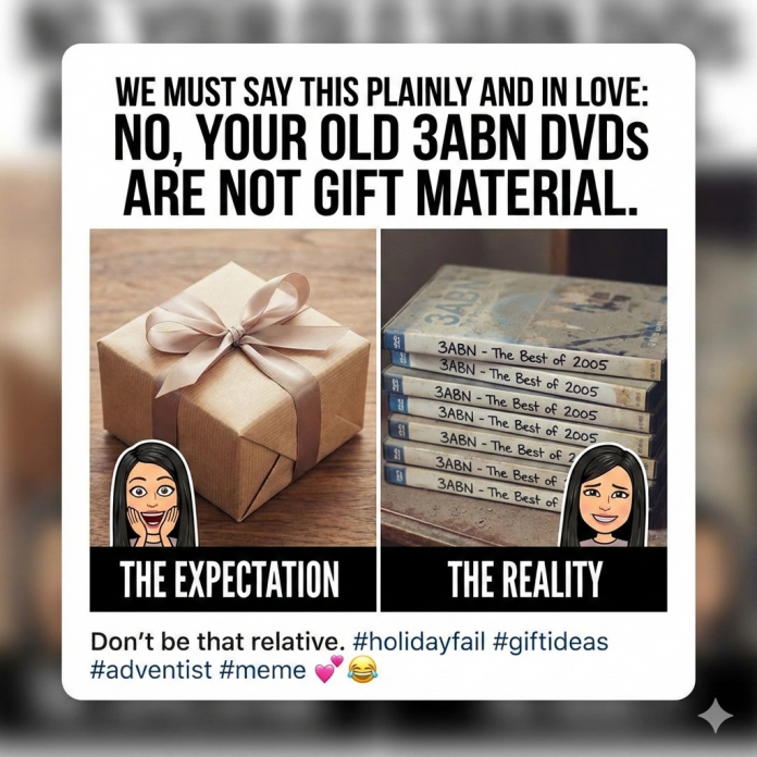 This includes framed art, cutting boards, and suspiciously specific throw pillows. - We must say this plainly and in love: no, your old 3ABN DVDs are not gift material.